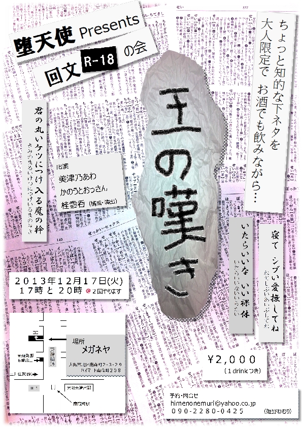 辞書の中の性的な言葉を読むだけで体の芯が熱くなった、あの中学2年の感受性のままにひとり作りためた回文が百あまり。その選りすぐりを、豪華な役者陣によるコントもまじえて発表する初の試みです。